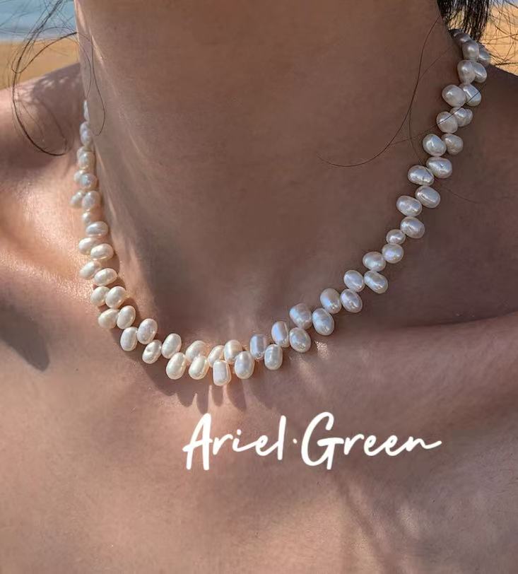 The Luna Seed Necklace celebrates individuality through the beauty of imperfection. Each pearl is naturally shaped like a small bean — organic, smooth, and full of character. Together, they form a captivating strand that feels alive, flowing gently around the neck with soft natural luster.